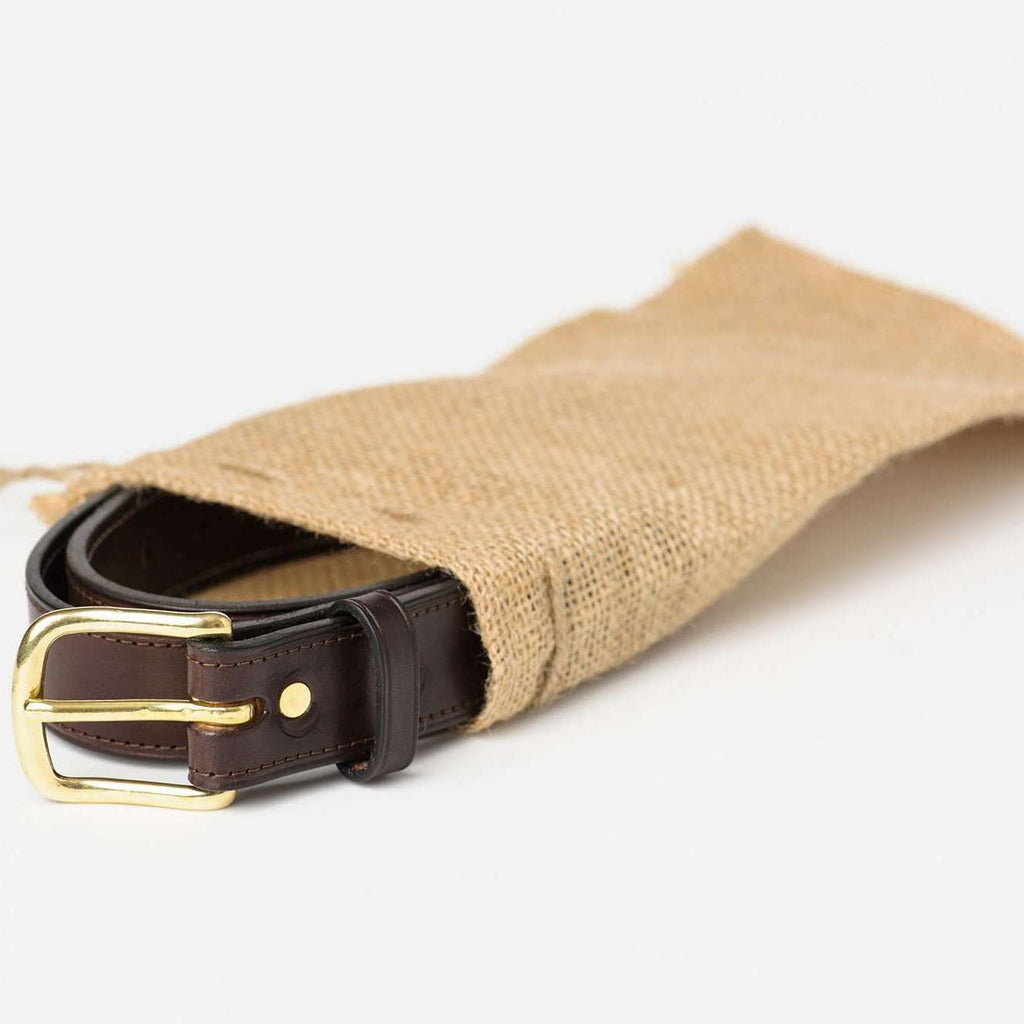 Our Brown Thoroughbred Bridle Leather Belt is a rich natural chocolate color with subtle handstitched detail. Our one-of-a-kind belt features a polished single prong gold tone buckle, for long lasting durability. As with any quality bridle or saddle maker, our pride is in the finish of the leather of each piece. Bridle leather belts have both the raw ends of the flesh and grain sides of the leather finished with wax which allows for long lasting wear for years to come. This labor intensive process goes into each of our leather pieces handcrafted for our clients' discerning palettes. Your Thoroughbred Belt will arrive stiff, in a custom burlap dust bag and require wear to mold to your specific measurements. Handmade here in Lexington, Kentucky, known as the "Horse Capital of the World," it is the heart of the state's Bluegrass region.