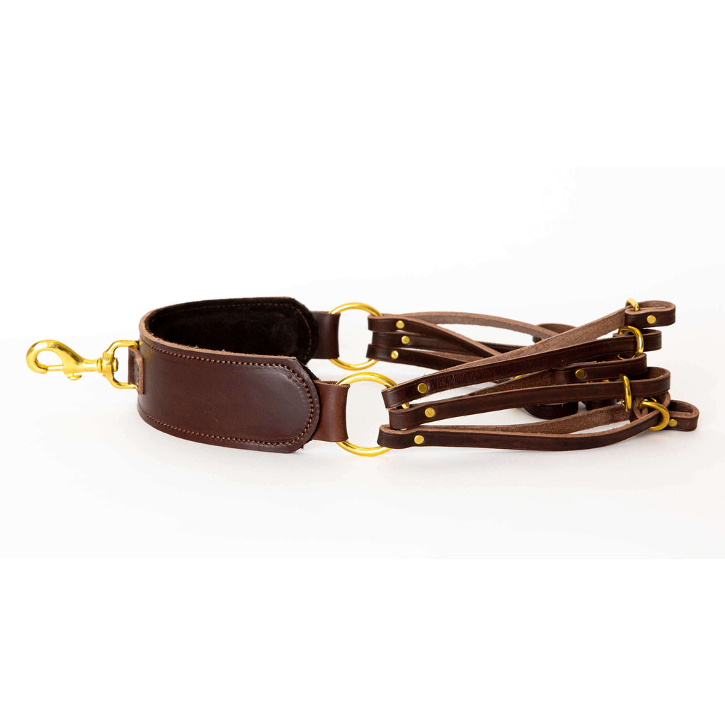 Take the work out of hauling ducks, geese, or pheasant out of the field with our handcrafted Game Strap. A traditional game strap designed to take the pain and work out of lugging your day's haul, this long-lasting saddle bridle leather carrier combines a leather shoulder pad with a solid brass halter snap on top so you to hang it anywhere. Outfitted with brass hardware, this bird carrier features 12 bird loops. Frees your hands to carry decoys and other gear. Made in Kentucky from saddle bridle.
