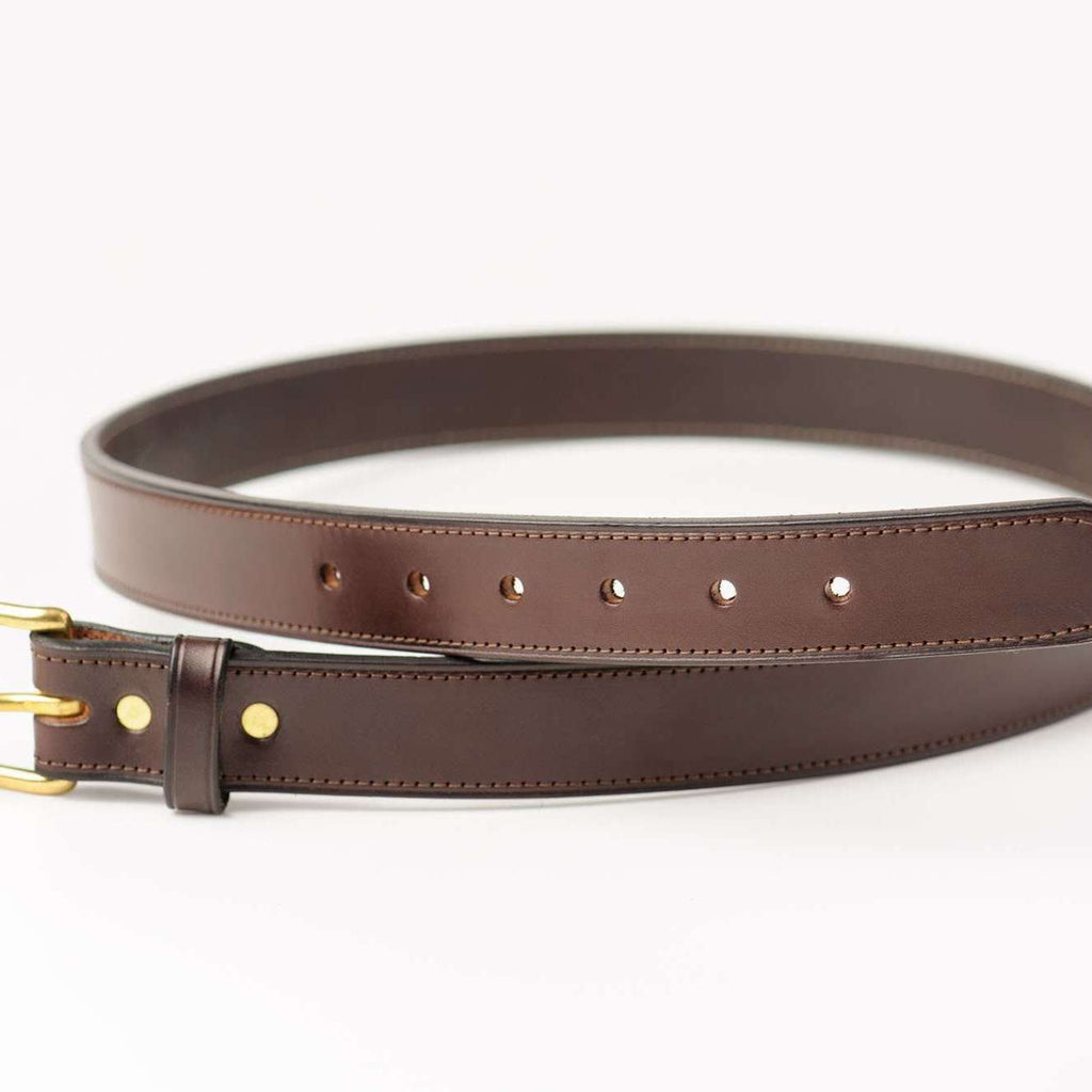 Our Brown Thoroughbred Bridle Leather Belt is a rich natural chocolate color with subtle handstitched detail. Our one of a kind belt features a polished single prong gold tone buckle, for long lasting durability. As with any quality bridle or saddle maker, our pride is in the finish of the leather of each piece. Bridle leather belts have both the raw ends of the flesh and grain sides of the leather finished with wax which allows for long lasting wear for years to come. This labor intensive process goes into each of our leather pieces handcrafted for our clients' discerning palettes. Your Thoroughbred Belt will arrive stiff, in a custom burlap dust bag and require wear to mold to your specific measurements. Handmade here in Lexington, Kentucky, also known as the "Horse Capital of the World," it is the heart of the state's Bluegrass region.